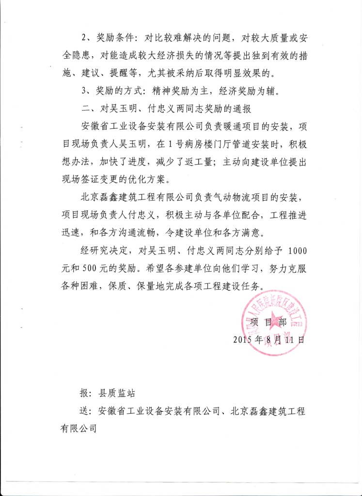 8月11日,鳳陽縣人民醫(yī)院新院區(qū)建設(shè)工程項(xiàng)目部發(fā)來賀文,就公司第九分公司承攬的鳳陽縣人民醫(yī)院新院區(qū)暖通項(xiàng)目安裝工程表示肯定,并對(duì)該項(xiàng)目的現(xiàn)場負(fù)責(zé)人吳玉明同志給予表彰和獎(jiǎng)勵(lì)通報(bào)。