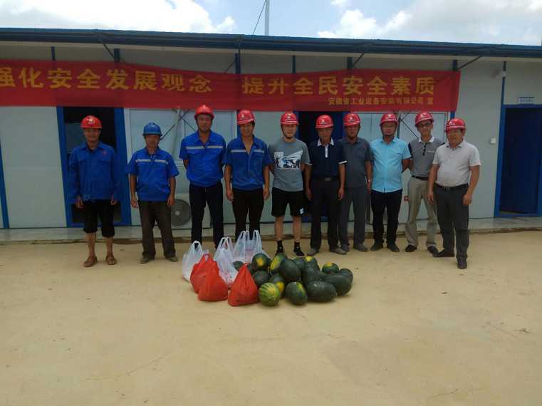 烈日炎炎,酷暑難當,6月28日上午,安裝安裝第四分公司經理趙永峰在分公司副經理姜田斌,工程科、安全科負責人的陪同下,來到廣東省清遠市印染行業污水處理項目,看望和慰問奮戰在一線的員工,為他們送去綠豆、白糖、西瓜、藿香正氣水、十滴水、仁丹等防暑降溫物品,實地察看了項目工地和職工生活區,并與項目同志進行了座談交流 。