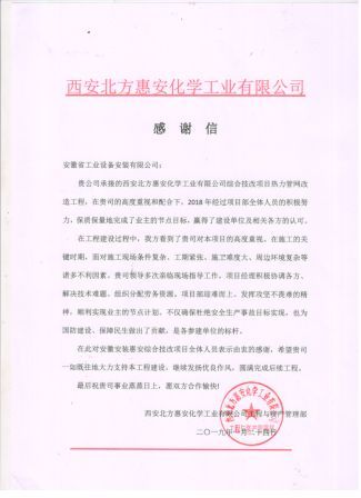 近日,安徽安裝承建的西安北方惠安化學(xué)工業(yè)有限公司綜合技改項目熱力管網(wǎng)改造工程,經(jīng)項目部全體人員共同努力,保質(zhì)保量地完成了業(yè)主的節(jié)點目標(biāo),贏得了業(yè)主高度認(rèn)可和好評,被業(yè)主授予“優(yōu)秀項目部”榮譽稱號,成為各參建單位的標(biāo)桿,業(yè)主特別頒發(fā)了榮譽證書和感謝信感謝項目全體人員所作出的貢獻,