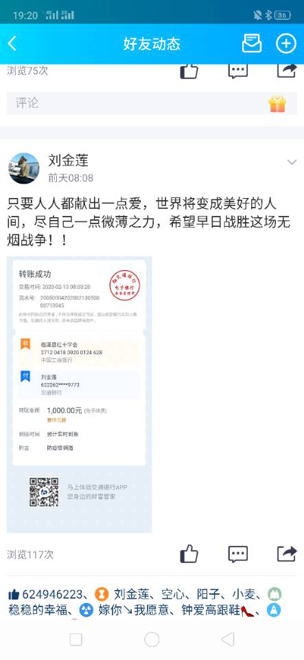 她就是寧夏辦事處職工劉金蓮同志。劉金蓮同志在工作中認真積極,是一名陽光樂觀、任勞任怨的優秀員工,她在平時生活工作中也總是積極主動的幫助他人。在這次疫情爆發后,2月13日,劉金蓮同志主動聯系當地甘肅省臨澤縣紅十字會,通過線上微信轉賬的方式,轉給紅十字會捐款人民幣1000元。接下來,她又主動聯系當地紅十字會工作人員,要求主動擔當志愿者,但是因為客觀原因,沒有被批準。