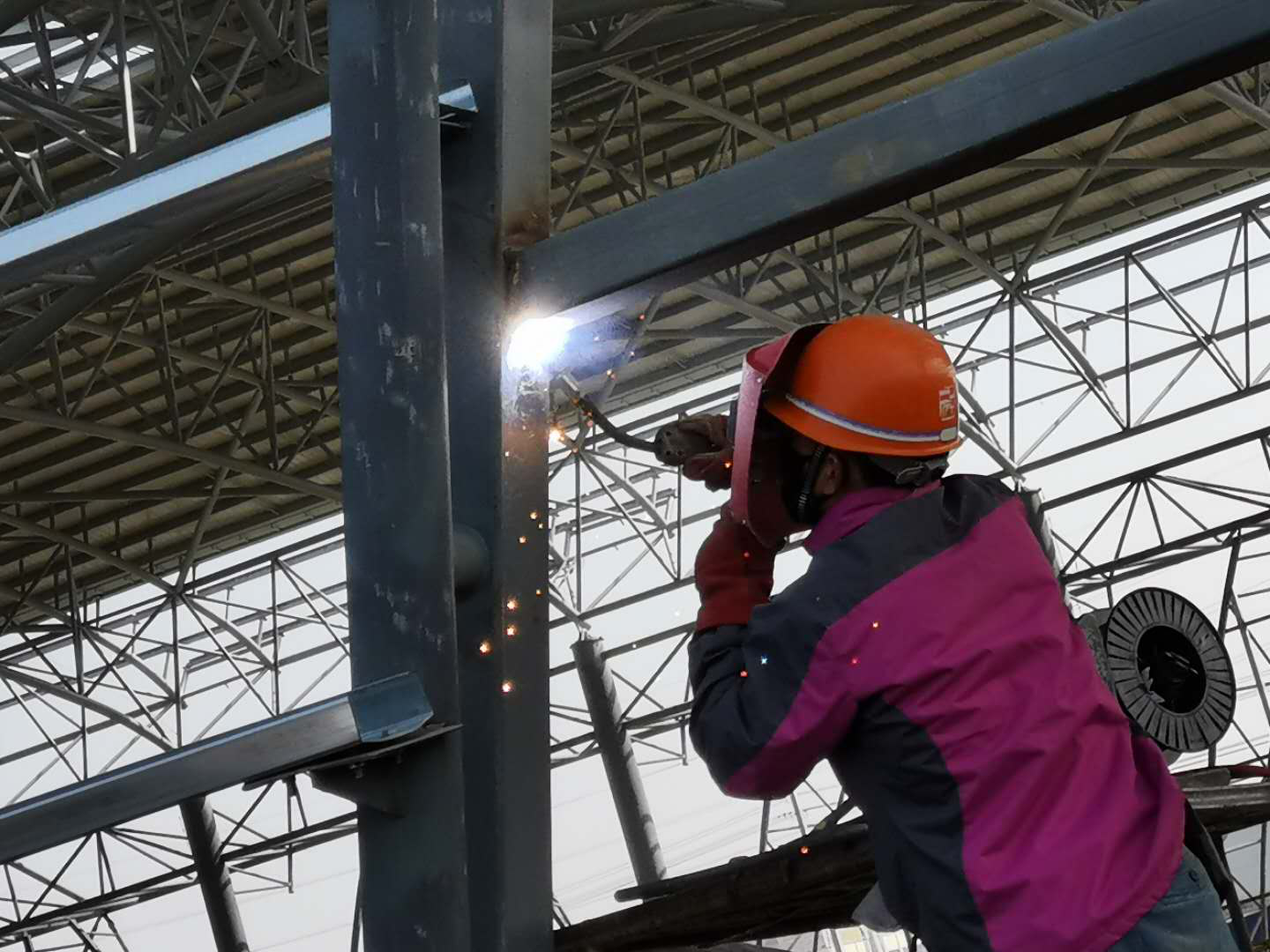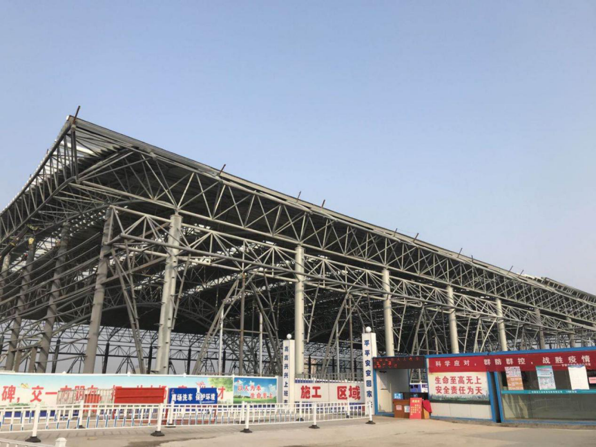 安徽省·水利部淮河水利委員會水利科學研究院淮河試驗研究中心(水工河工模型試驗廳)一期工程,水工河工模型試驗廳主要進行各種水流模型試驗,通過整體水工模型試驗,率定泄洪閘、排沙孔泄流能力、描述進出口水流流態,對護岸范圍提出合理的防護方式,優化泄洪消能建筑物布置和體型等發揮巨大作用。項目主要施工內容為新建水工河工模型試驗一廳鋼結構及附屬土建工程,建筑面積約20000㎡,基礎形式為長螺旋鉆孔灌注樁,結構形式為排架柱(圓鋼管)+三肢管桁架結構,頂部成弧形空間結構形式,桁架跨度約100m,跨中為四聯拱(三角桁架),安裝高度最高24m,鋼材用量1800多噸,為目前安徽省建設第二大跨度的鋼結構工程。目前,該項目整體鋼結構建設已基本完成,主要施工內容是水電安裝、裝飾、幕墻各個分項建設。