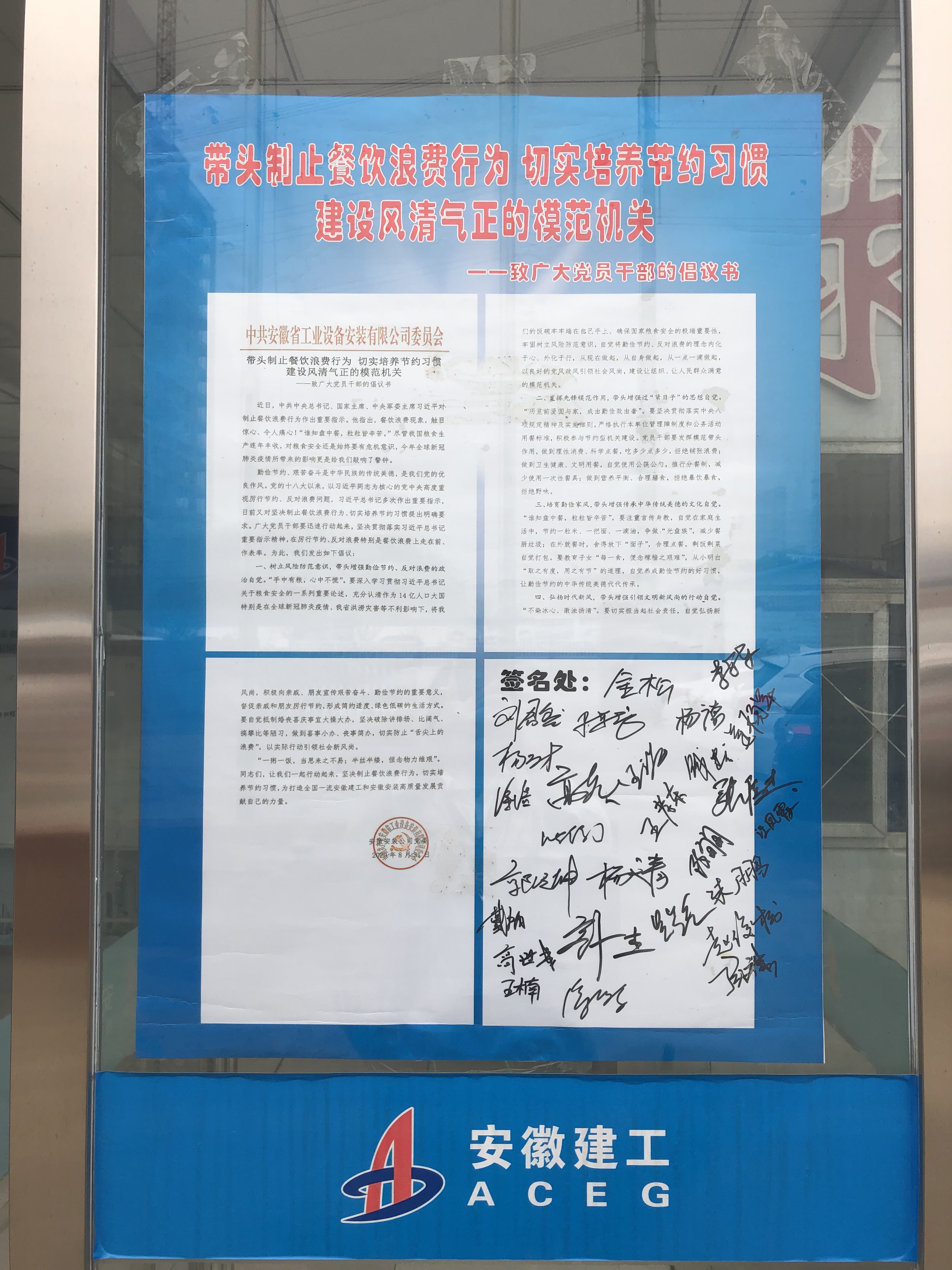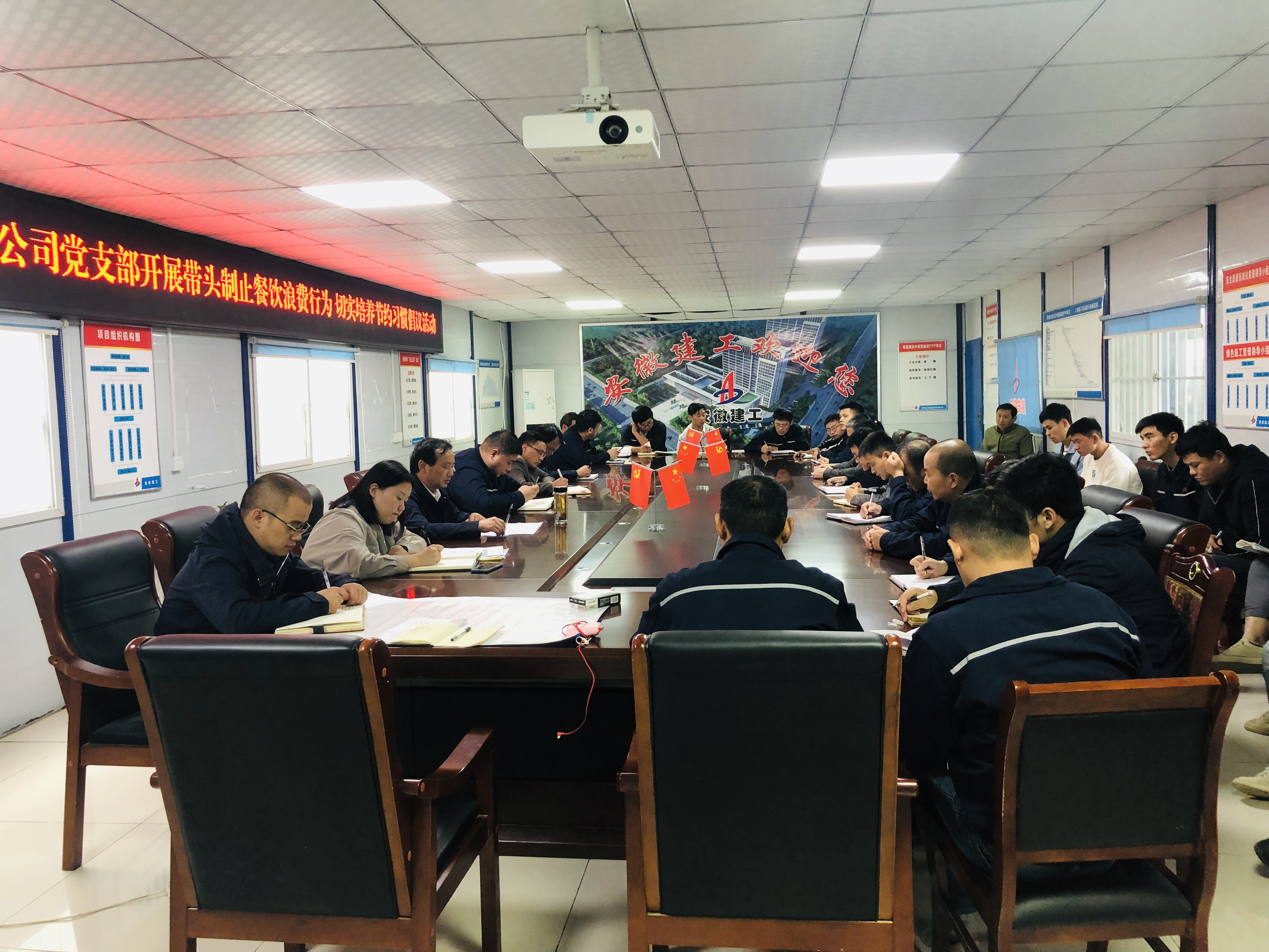 10月15日,房建(裝飾)分公司黨支部在阜陽潁東中醫院PPP建設項目組織集中學習宣傳貫徹習近平總書記考察安徽重要講話精神及開展帶頭制止餐飲浪費行為切實培養節約習慣的倡議簽名活動。