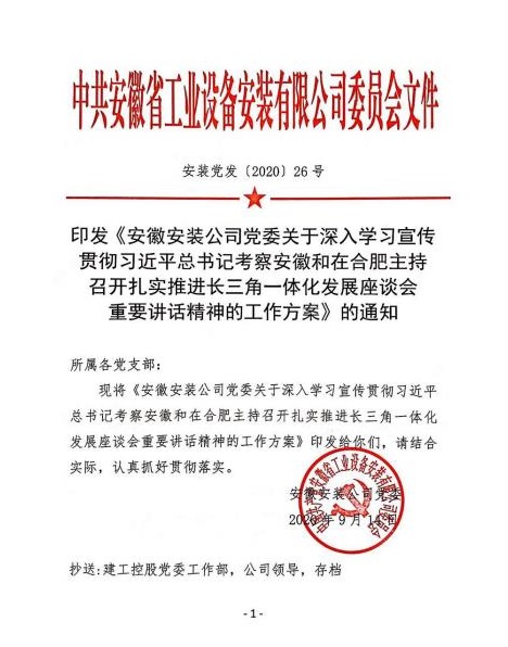 一是公司黨委迅速嚴密部署學習宣傳貫徹各項工作。98日,公司黨委理論中心組率先帶頭,認真學習重要講話精神,深刻交流研討。914日,安徽安裝公司黨委下發《關于深入學習宣傳貫徹習近平總書記考察安徽和在合肥主持召開扎實推進長三角一體化發展座談會重要講話精神的工作方案》,結合公司實際,精心嚴密部署“大學習”“大宣傳”“大貫徹”和“大落實”工作,確保公司上下人人都學習,人人都領會。