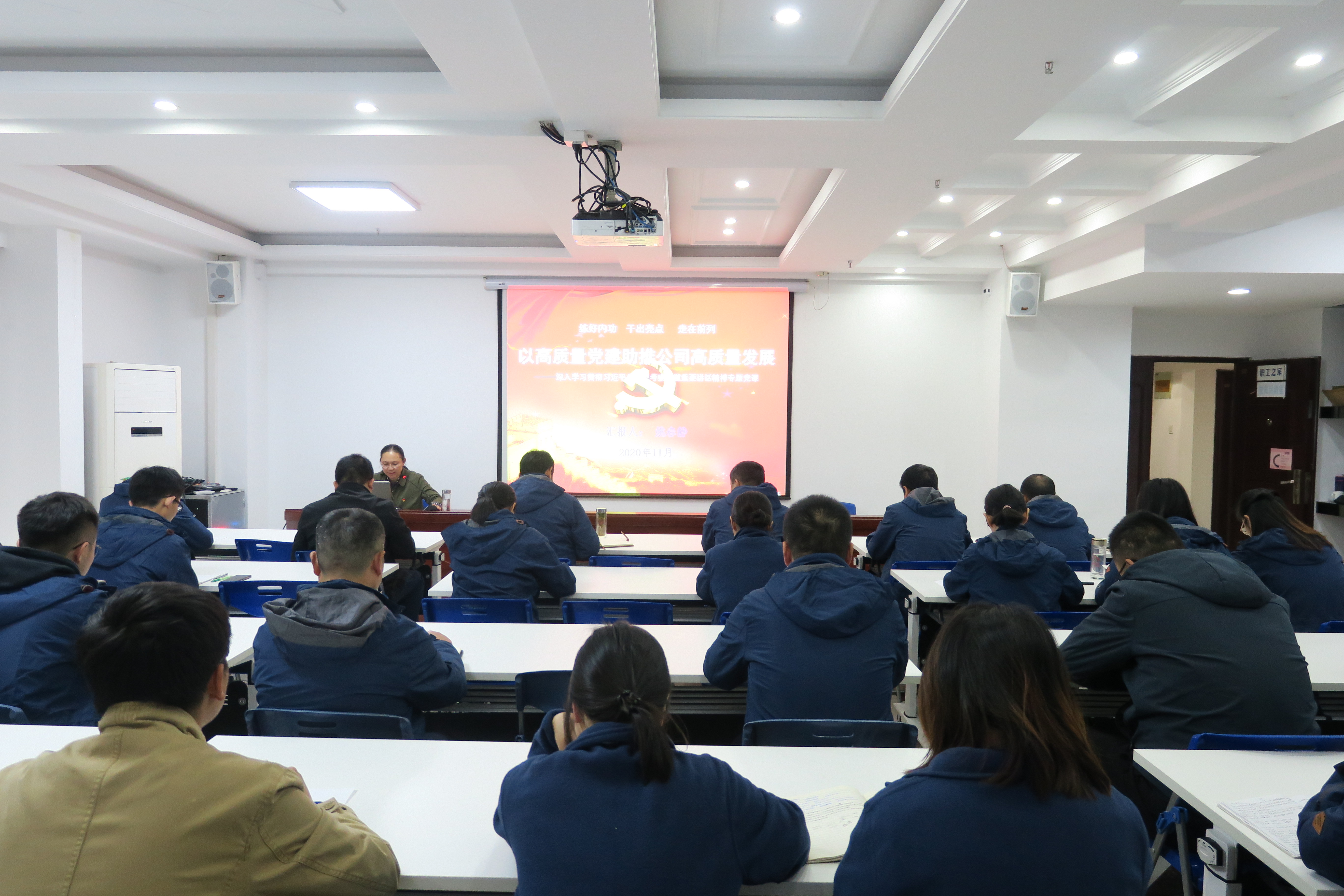 11月19日下午,公司機(jī)關(guān)第二黨支部書記姚春靜赴合肥分公司作題為《練好內(nèi)功·干出亮點(diǎn)·走在前列 以高質(zhì)量黨建助推公司高質(zhì)量發(fā)展——深入學(xué)習(xí)貫徹習(xí)近平總書記考察安徽重要講話精神》專題黨課,分公司領(lǐng)導(dǎo)班子成員、支部黨員、入黨積極分子、青年團(tuán)員、機(jī)關(guān)及在肥人員共40余人參加了會(huì)議。會(huì)議以視頻的方式進(jìn)行,主會(huì)場(chǎng)設(shè)在公司職工之家,靈璧項(xiàng)目部、潛山項(xiàng)目部設(shè)立了分會(huì)場(chǎng)。