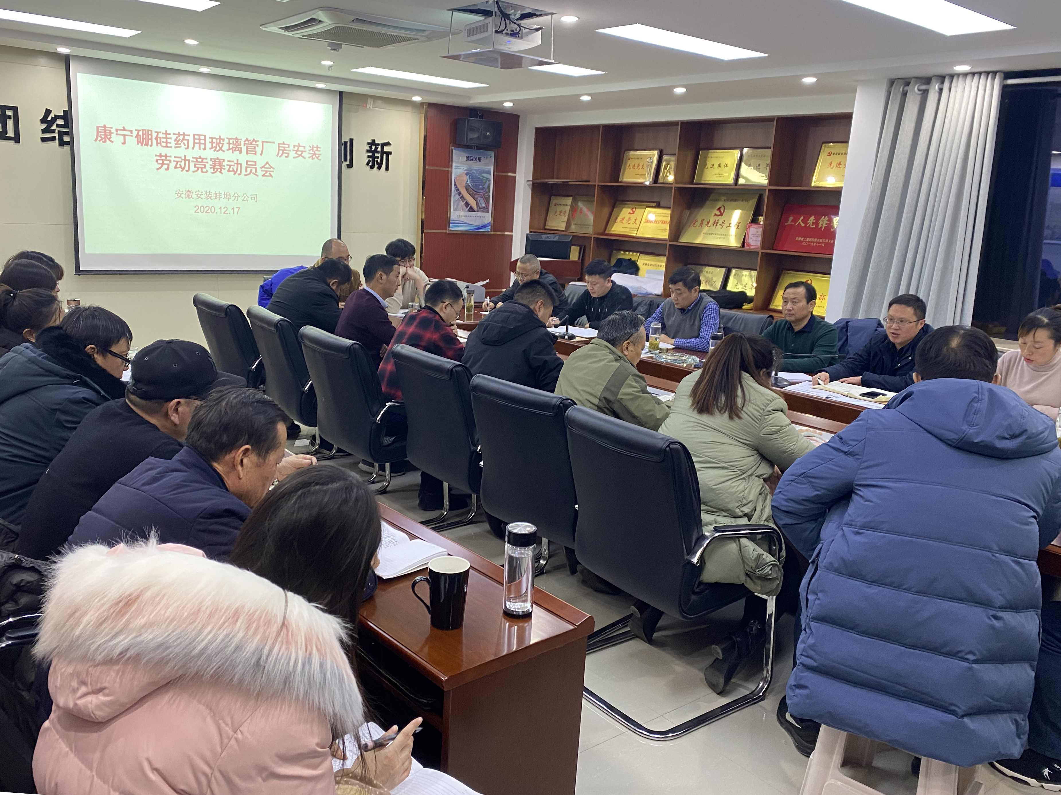 為加快推動(dòng)康寧硼硅醫(yī)用玻璃項(xiàng)目全面快速達(dá)產(chǎn),充分調(diào)動(dòng)員工工作的主動(dòng)性和積極性,貫徹落實(shí)集團(tuán)公司“戰(zhàn)疫情、搶工期、保目標(biāo)、促超產(chǎn)”為主題的勞動(dòng)競(jìng)賽活動(dòng)精神,12月17日晚,蚌埠分公司召開康寧項(xiàng)目“大干100天,決戰(zhàn)3.31”的勞動(dòng)競(jìng)賽動(dòng)員會(huì)。公司副總經(jīng)理、現(xiàn)場(chǎng)施工管理指揮部副指揮長(zhǎng)劉安俊(常務(wù))和高飛,公司工程管理部、經(jīng)營(yíng)部、物資部、招標(biāo)辦、紀(jì)檢監(jiān)察室負(fù)責(zé)人及分公司領(lǐng)導(dǎo)班子成員、參戰(zhàn)項(xiàng)目管理人員及分公司機(jī)關(guān)全體人員30余人參加會(huì)議。