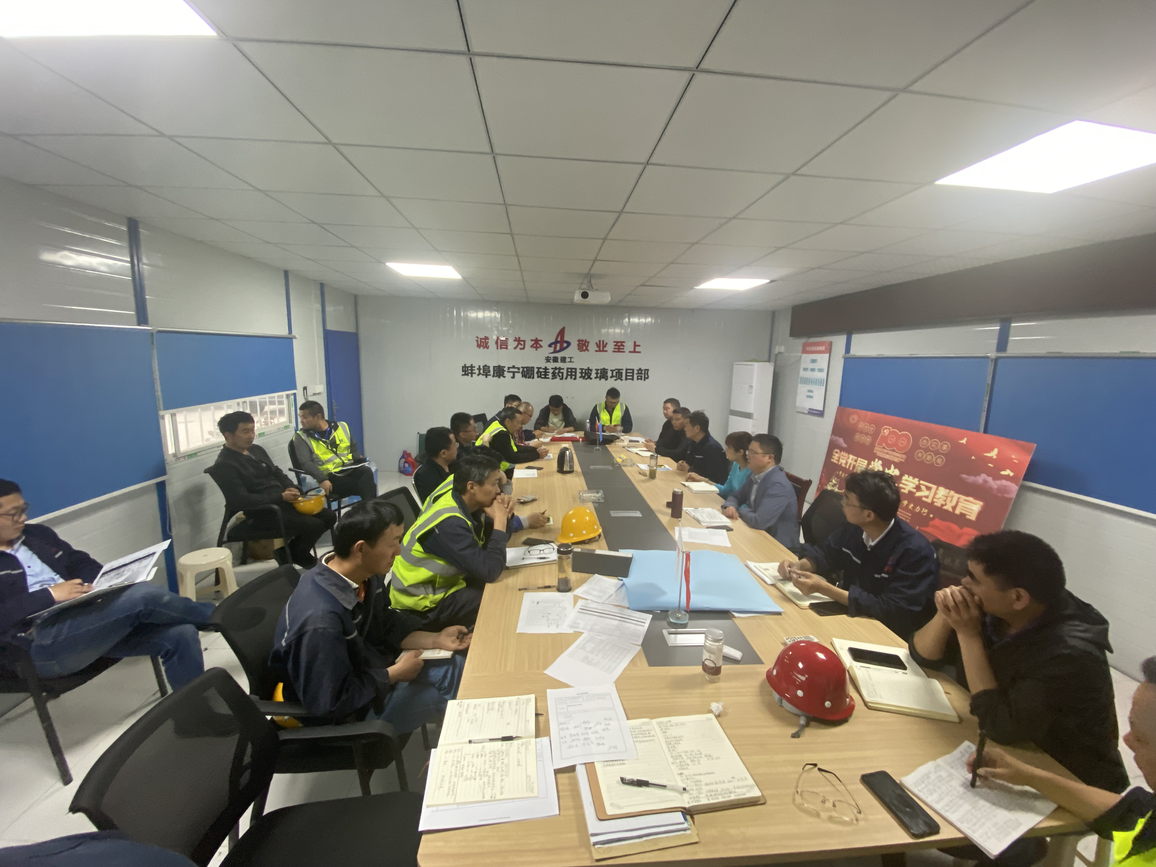 5月18日,雖然已是晚間八點(diǎn)多,但是位于蚌埠市中環(huán)線南、中糧大道以西的康寧藥用玻璃管項(xiàng)目現(xiàn)場到處是一片繁忙的景象。項(xiàng)目部會(huì)議室內(nèi)燈火通明,全體參戰(zhàn)人員正在召開項(xiàng)目協(xié)調(diào)推進(jìn)會(huì),而在不遠(yuǎn)處的施工現(xiàn)場,機(jī)器設(shè)備聲轟鳴,百十名施工人員在各自的崗位上緊張而有序地忙碌著。