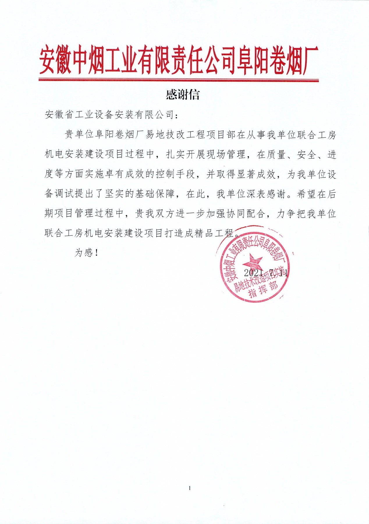 一封感謝信,字字鼓人心!此次收到業(yè)主單位的感謝信,是對安徽安裝蚌埠分公司在阜陽卷煙廠項目建設中發(fā)揮的積極作用的肯定,對維護公司在煙草行業(yè)的良好信譽、進一步擴大影響力具有積極意義。項目部表示:實干出成績,干好現(xiàn)場贏市場,將以此為動力,在后續(xù)施工中,繼續(xù)擔當作為,力爭將聯(lián)合工房機電安裝建設項目打造成優(yōu)質(zhì)精品工程,樹立安徽安裝良好形象。