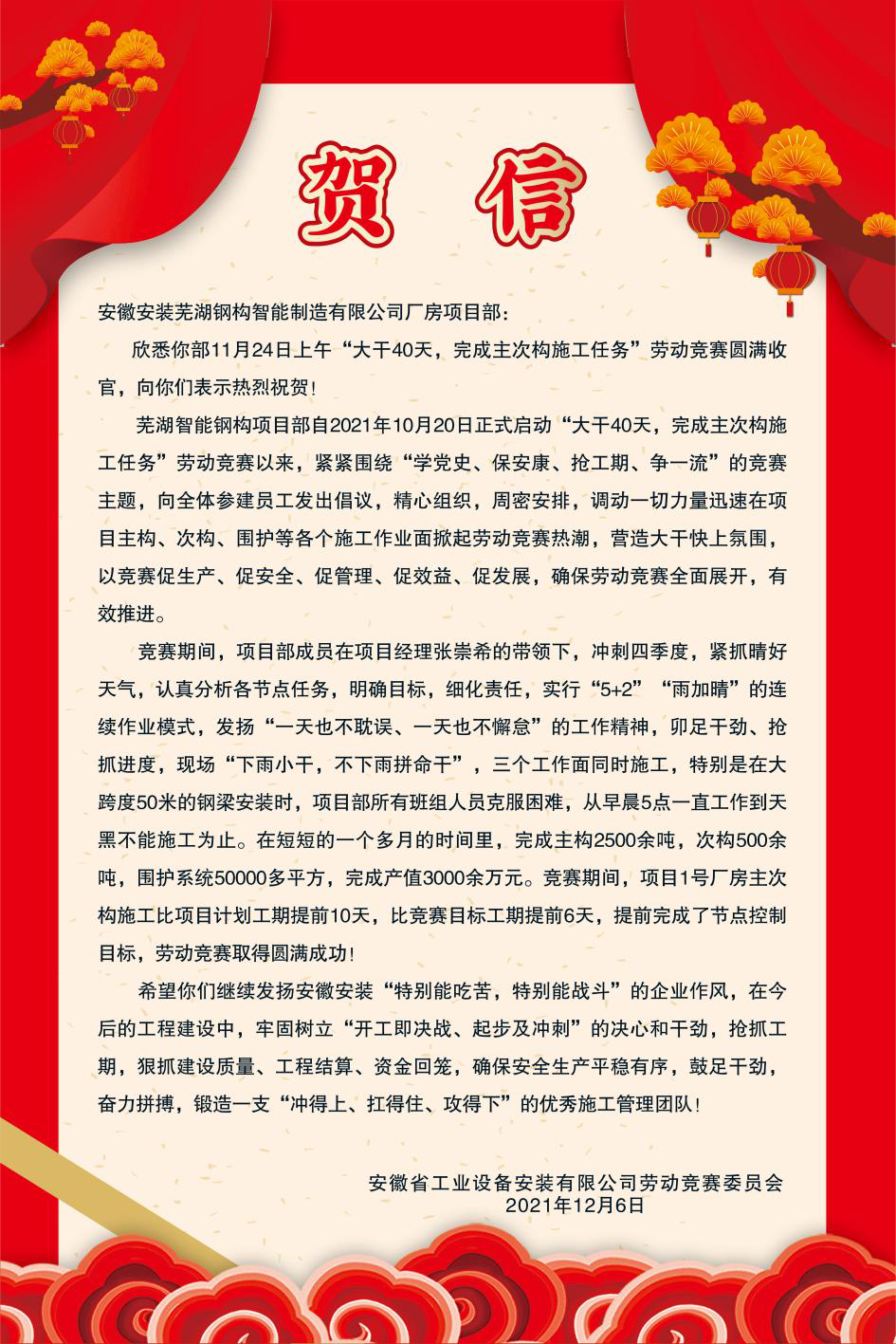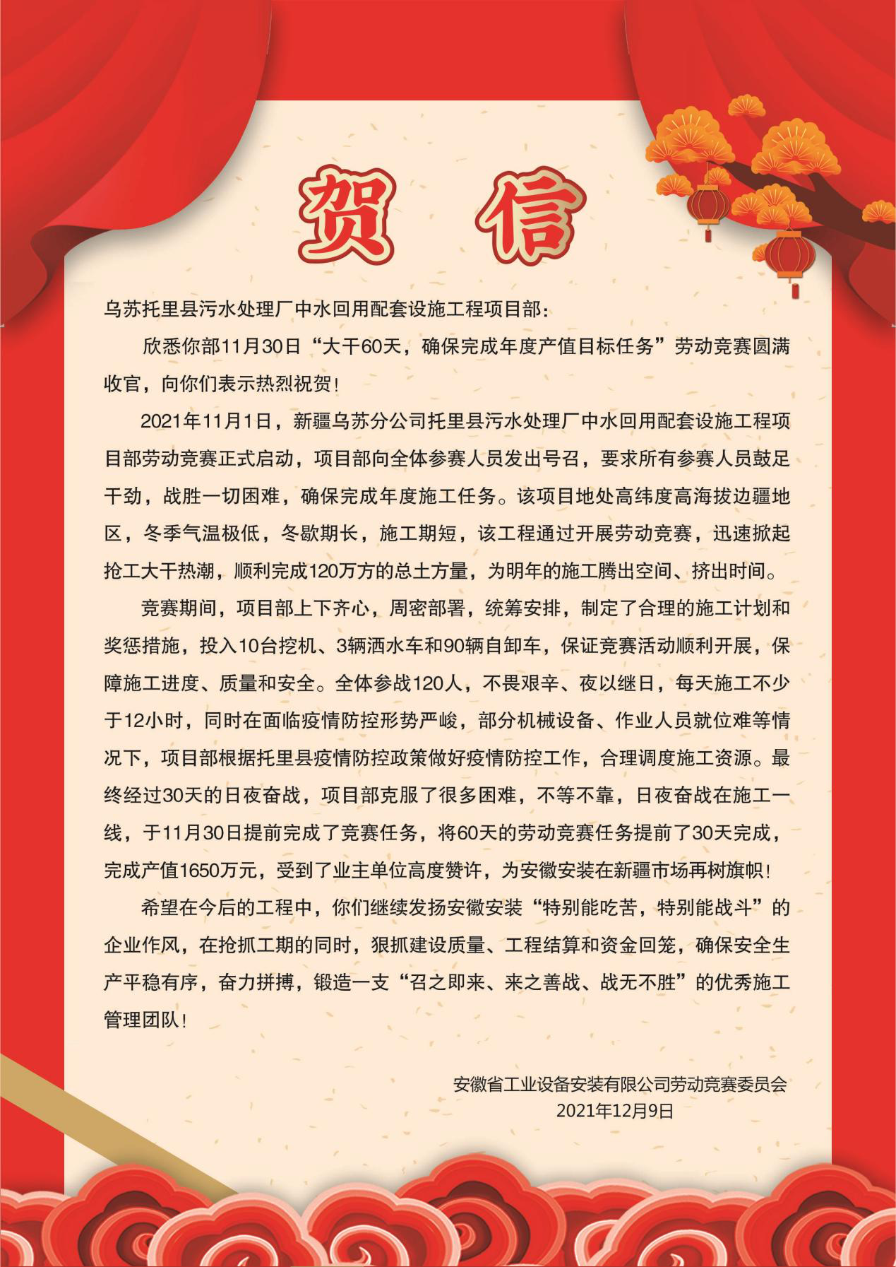 近日,公司勞動競賽委員會向蕪湖鋼構智能制造有限公司廠房鋼結構項目部和新疆托里縣污水處理廠中水回用配套設施工程項目部發出賀信,祝賀兩項目部勞動競賽圓滿完成!