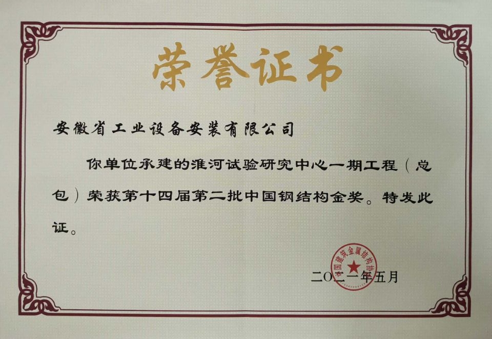 2021年公司首次一年內獲得兩項國家級優質工程獎,即中國鋼結構金獎、中國安裝工程優質獎(安裝之星)。
