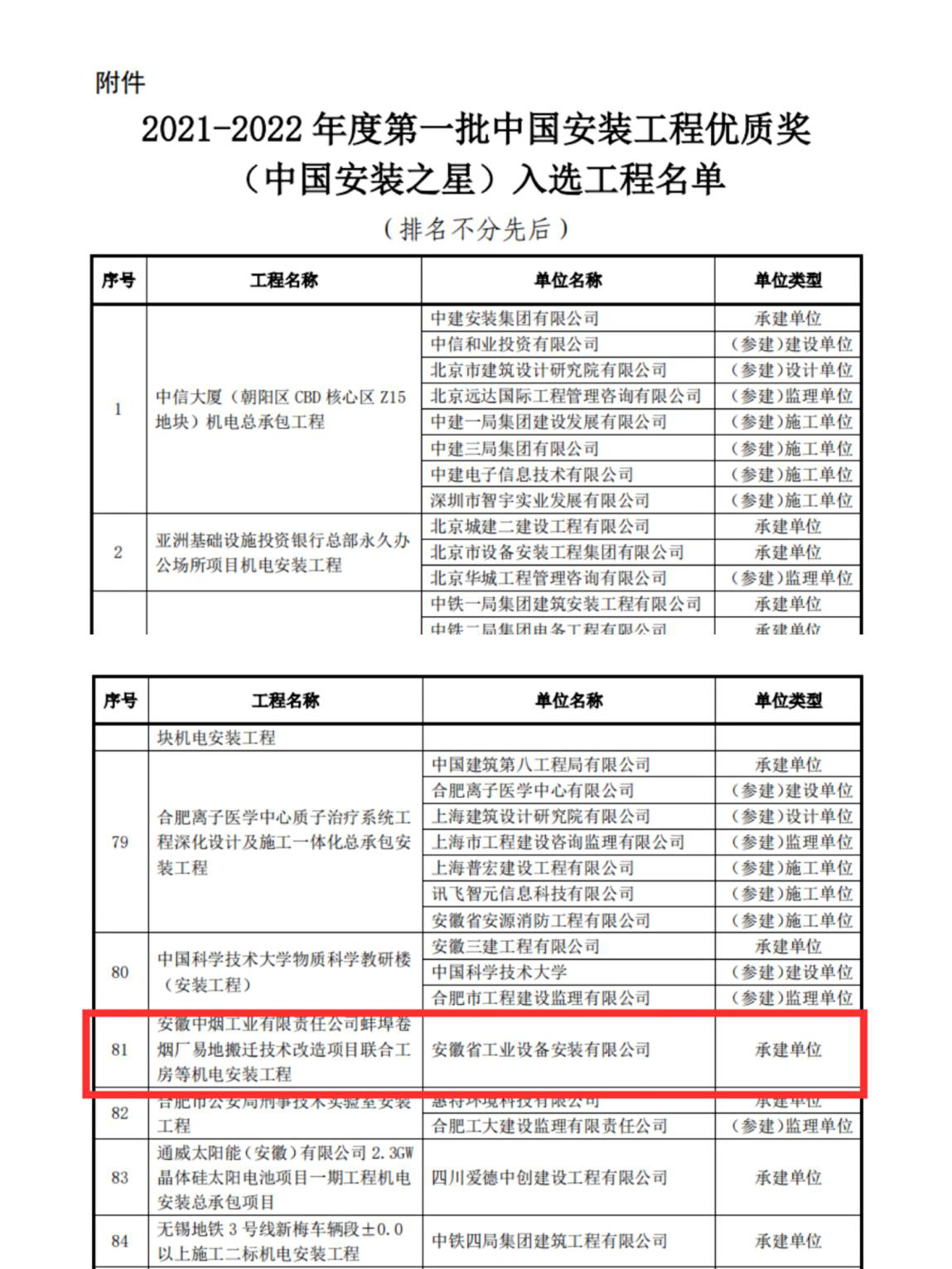 安徽安裝公司2021年獲得兩項國家級優質工程獎
