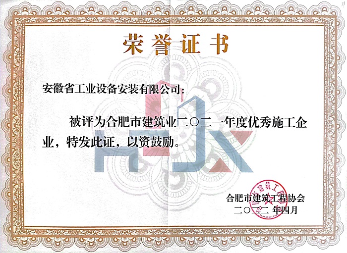 近日,合肥市建筑工程協會傳來喜訊,2021年度合肥市優秀企業、單項先進企業的評選已出爐,安徽安裝再次斬獲“合肥建筑業優秀施工企業”“合肥建筑業安全管理先進企業”榮譽稱號。