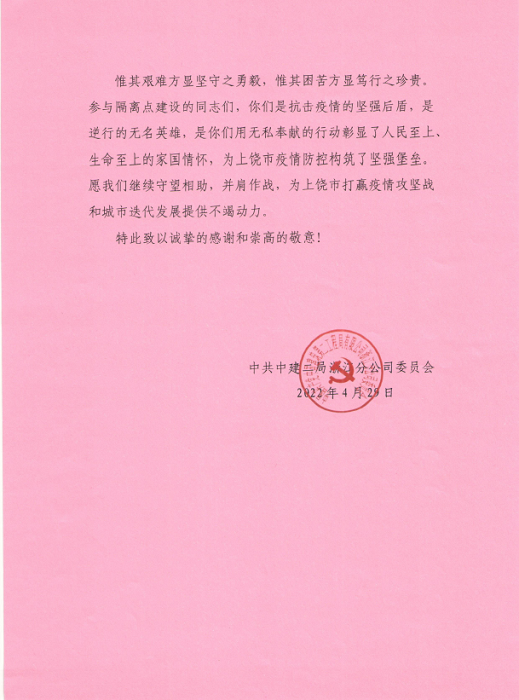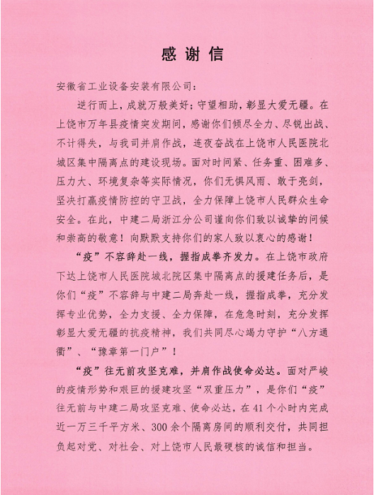 信中對安徽安裝公司與中建二局浙江分公司共同援建上饒市人民醫(yī)院北城區(qū)集中隔離點給予高度的肯定和認可。當前,新冠疫情形勢嚴峻,安徽安裝公司在嚴格落實屬地疫情防控措施的同時,一方面積極參與本地區(qū)隔離點、醫(yī)院發(fā)熱門診的緊急建設(shè)任務(wù);另一方面攜手相關(guān)行業(yè)兄弟單位同心協(xié)力、援建市外防疫區(qū)域,承擔起國有企業(yè)社會責任,竭盡所能地為防疫建設(shè)貢獻最大的力量!