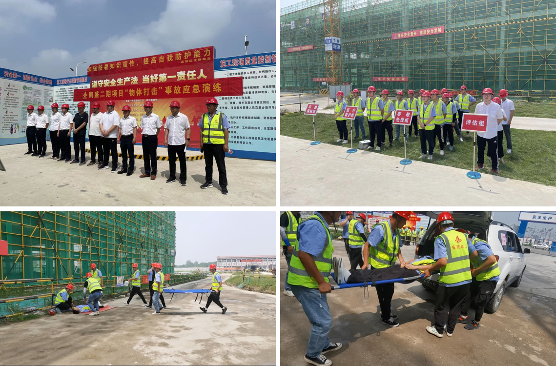 為了落實公司、分公司安全生產月的各項活動部署,進一步提升施工現場人員的安全防范意識及應急救援處置能力,6月20日上午10點,蚌埠分公司、房建(裝飾)分公司在凱盛科技超薄柔性玻璃二期項目施工現場聯合開展了“物體打擊”事故應急救援演練活動,公司安全管理部副經理蔣秀正、蚌埠分公司領導班子成員、房建(裝飾)分公司領導班子成員、監理單位代表、項目人員共30余人參加演練。