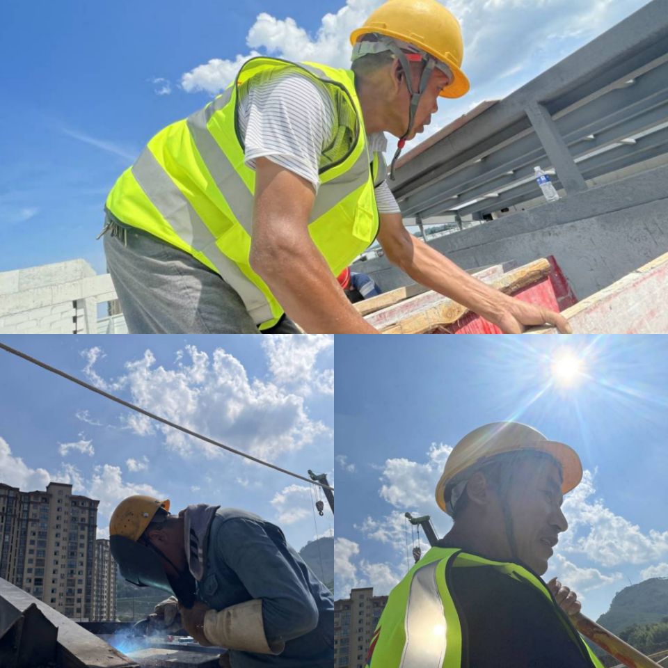 合肥分公司岳西恒泰城項目一線工人頂著38度高溫,揮汗如雨默默奉獻;圖為模板安裝、焊接作業及混凝土澆筑施工。