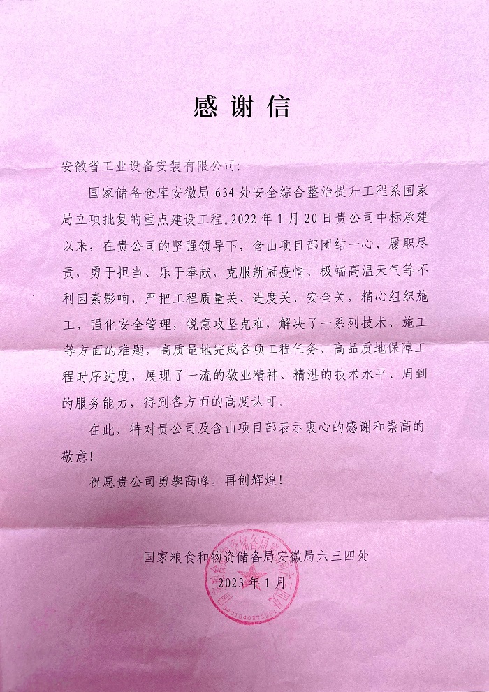 近日,安徽安裝合肥分公司收到業主方國家糧食和物資儲備局安徽局六三四處的感謝信,對公司“國家儲備倉庫安徽局634處安全綜合整治提升工程”克服諸多困難,精心組織,科學管理,高質量完成工程施工任務的突出成績給予高度贊揚,并表達了由衷感謝。