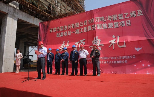 2011年4月28日,安徽省工業設備安裝公司滁州分公司承建的安徽華塑項目工程施工現場,到處場洋溢著一片祥和、喜慶的氣氛。上午10:18分,迎來了安徽華塑真空制鹽鹽硝車間土建主體結構封頂儀式。公司總經理王軍幫、副總經理劉安俊,華塑公司黨委書記黃家發、 副總經理梁東風,北京中輕國際工程管理有限公司現場總監郭均川等領導應邀出席了封頂儀式。本工程從開工到土建主體結構封頂,在質量、安全、進度等方面受到了業主和監理單位的一致好評,并獲得華塑園區二十多家施工單位綜合評比第二名得好成績。真空制鹽主體結構施工進度上創造了全國最短時間,為公司在今后進一步占領鹽化工程市場打下了堅實的基礎。