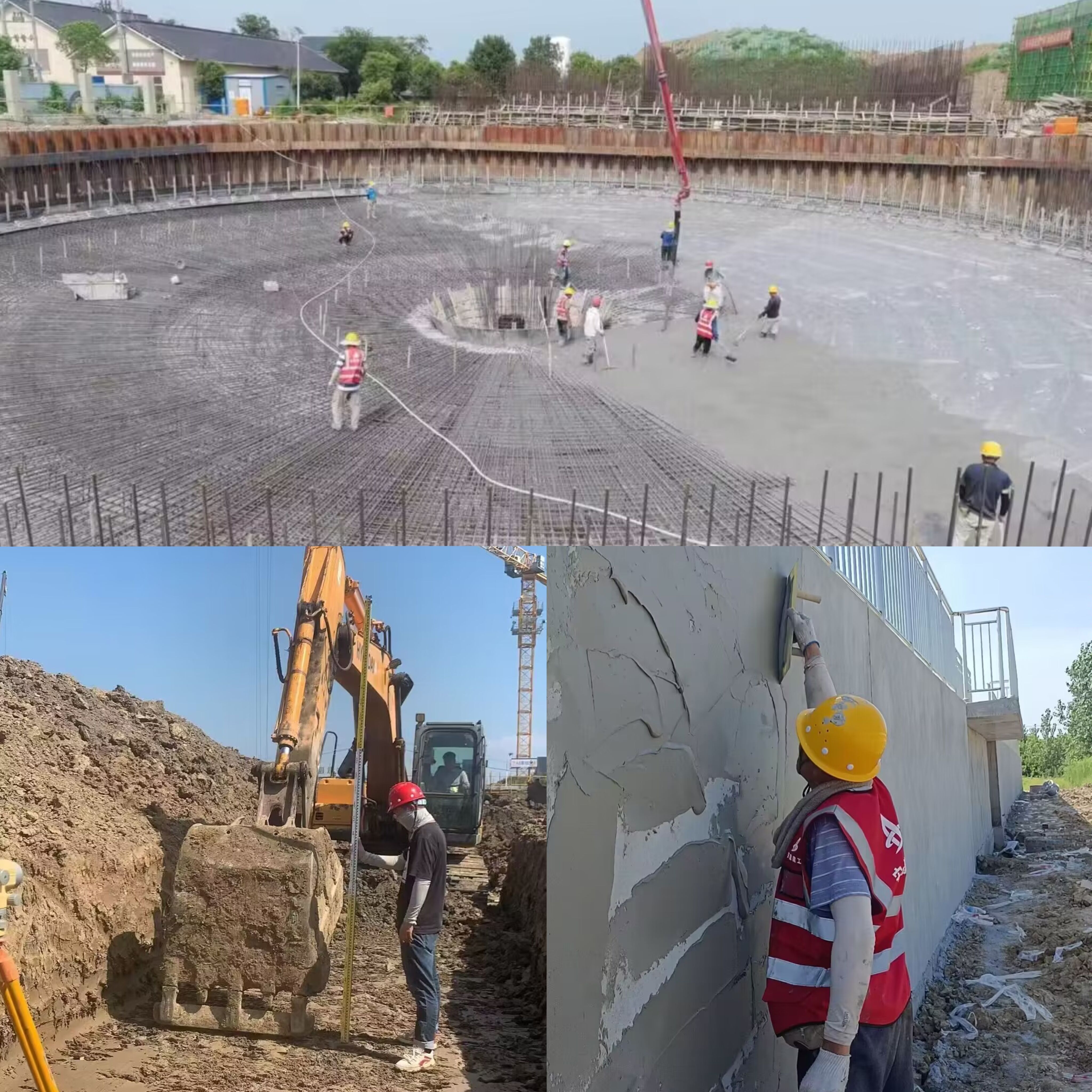 圖為:阜南城南污水處理廠改擴建及配套管網工程二沉池筏板混凝土澆筑、配電房基礎開挖及均質池外墻粉刷施工