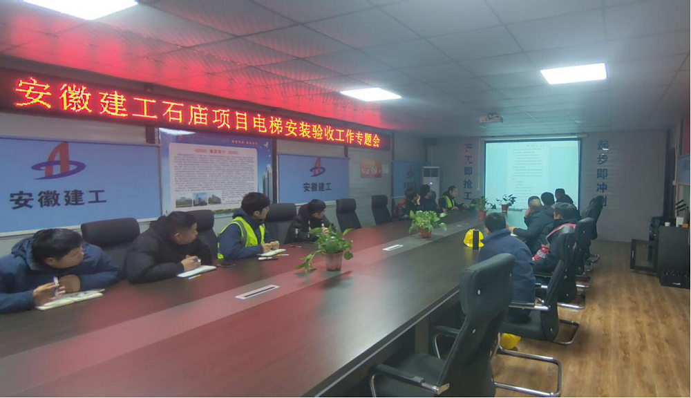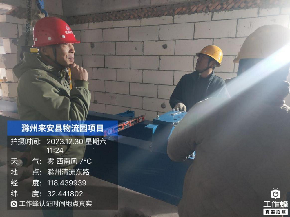 來安縣農副產品冷鏈物流產業園電梯安裝工程現場,項目經理帶班對電梯機房進行進度、質量、安全檢查,確保電梯安裝符合工程建設標準。