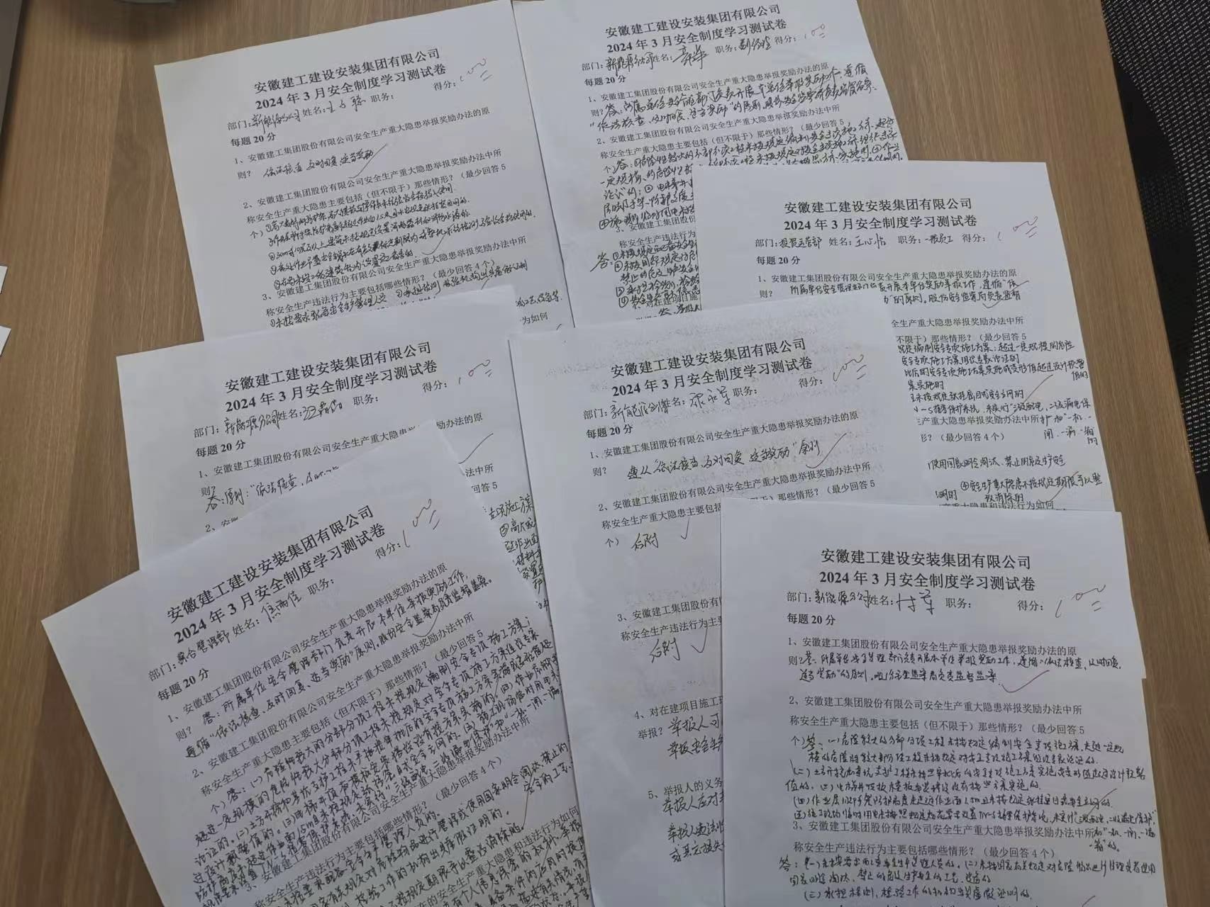 會上,郭萬升帶領全體員工集中學習了《安徽建工集團股份有限公司安全生產重大隱患舉辦獎勵辦法》,他強調分公司全體員工要扎實工作,注重細節,堅持“安全第一,預防為主,綜合治理,以人為本”十六字方針,以良好的精神面貌和充沛的精力,全身心投入到安全生產及各項工作中。會議結束后,分公司以書面考試形式對全員進行了測試,以鞏固學習成果。
