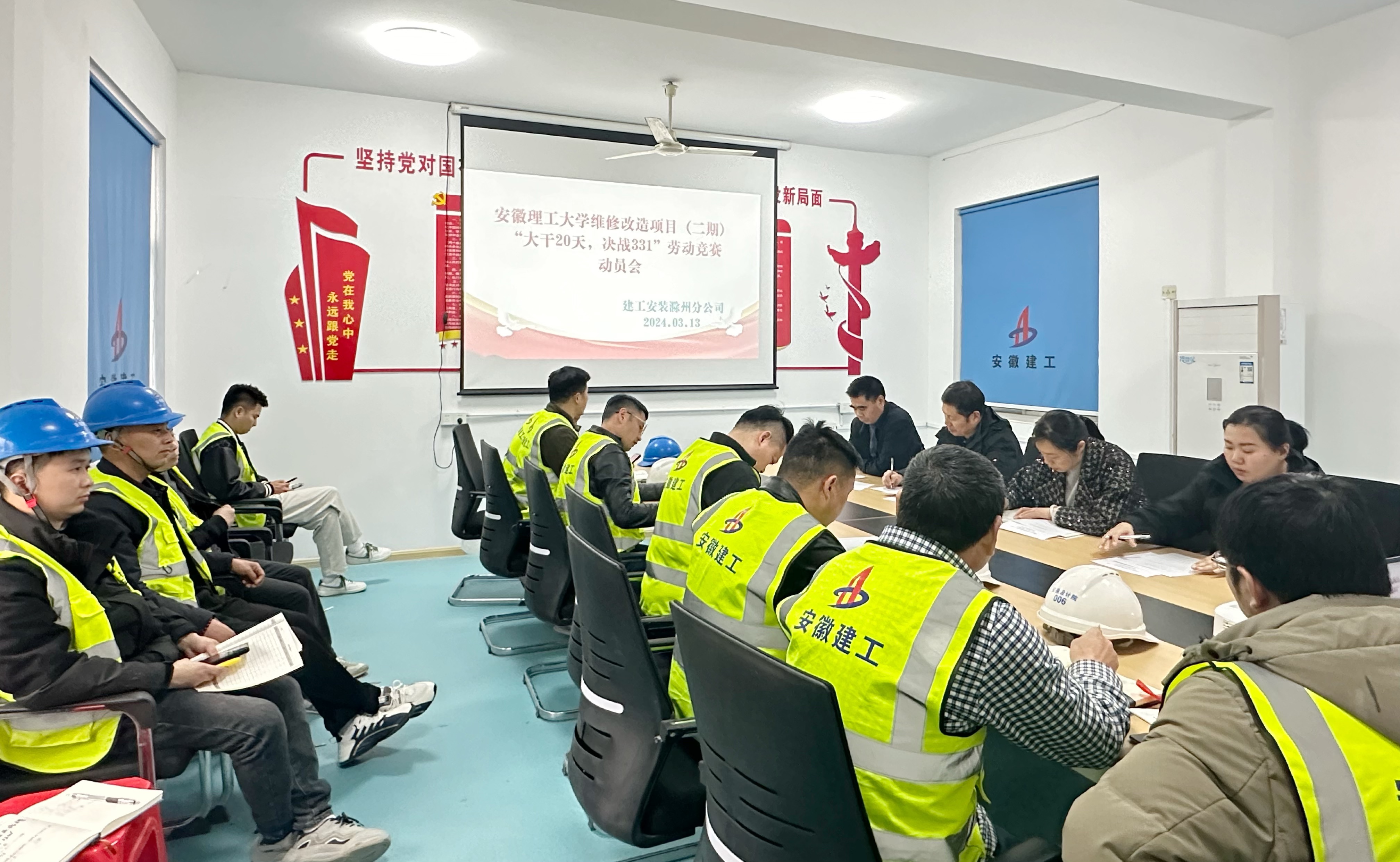 為深入學(xué)習(xí)貫徹集團(tuán)三屆一次職代會(huì)暨2024年工作會(huì)議和公司十七屆四次職代會(huì)精神,全面落實(shí)“項(xiàng)目管理強(qiáng)化年”工作部署和集團(tuán)2024年度“當(dāng)好主人翁建功大發(fā)展”勞動(dòng)競(jìng)賽活動(dòng)相關(guān)要求,3月13日下午,滁州分公司安徽理工大學(xué)維修改造(二期)項(xiàng)目在項(xiàng)目部現(xiàn)場(chǎng)召開了“大干20天、決戰(zhàn)3.31”勞動(dòng)競(jìng)賽動(dòng)員會(huì)。分公司黨支部書記、副經(jīng)理程茂麗,副經(jīng)理張漢軍等勞動(dòng)競(jìng)賽領(lǐng)導(dǎo)小組成員出席會(huì)議,項(xiàng)目部全體管理人員及施工班組代表參會(huì)。