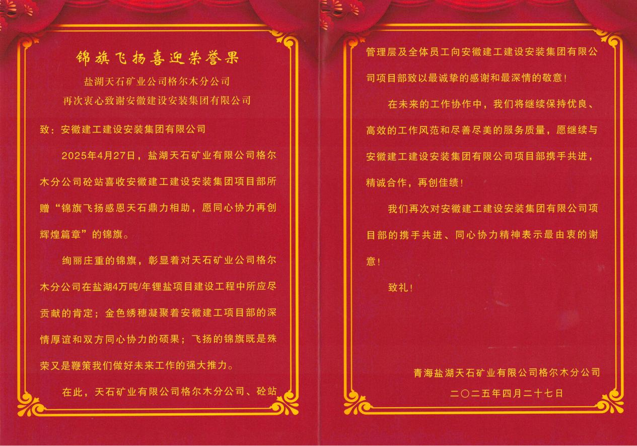 信中,青海鹽湖天石礦業(yè)有限公司格爾木分公司對建工安裝項目部此前慰問砼站全體員工致以最誠摯的感謝,愿繼續(xù)與建工安裝項目部攜手共進(jìn)、精誠合作、再創(chuàng)佳績!這封感謝信不僅是對項目部過往成績的肯定,更是一份振奮人心的激勵。建工安裝將繼續(xù)保持高昂斗志和嚴(yán)謹(jǐn)態(tài)度,加強(qiáng)與相關(guān)單位溝通協(xié)作,強(qiáng)化項目管理,確保項目按期、高質(zhì)量交付,為打造世界級鹽湖提鋰產(chǎn)業(yè)基地貢獻(xiàn)力量!