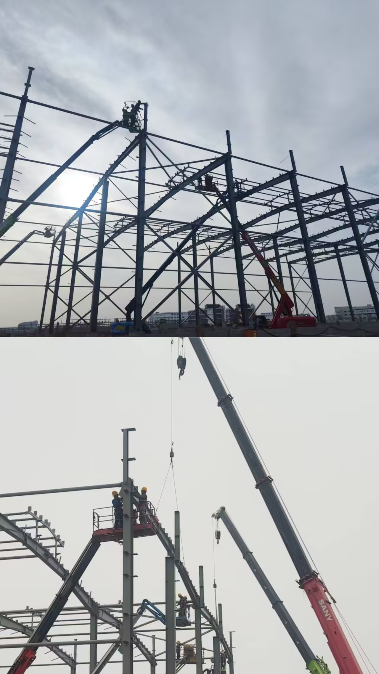 走進(jìn)項(xiàng)目施工現(xiàn)場,起重機(jī)揮動(dòng)著粗壯的鋼鐵臂膀劃破天際,將一段段鋼梁精準(zhǔn)的吊裝至安裝位,曲臂車托舉著工人將鋼構(gòu)件嵌入到預(yù)定位置,保障高空作業(yè)人員的生命安全。這是力量與技術(shù)的二重奏,更是安全與效率的完美平衡,一幅現(xiàn)代工業(yè)建筑的壯美畫卷正徐徐展開。